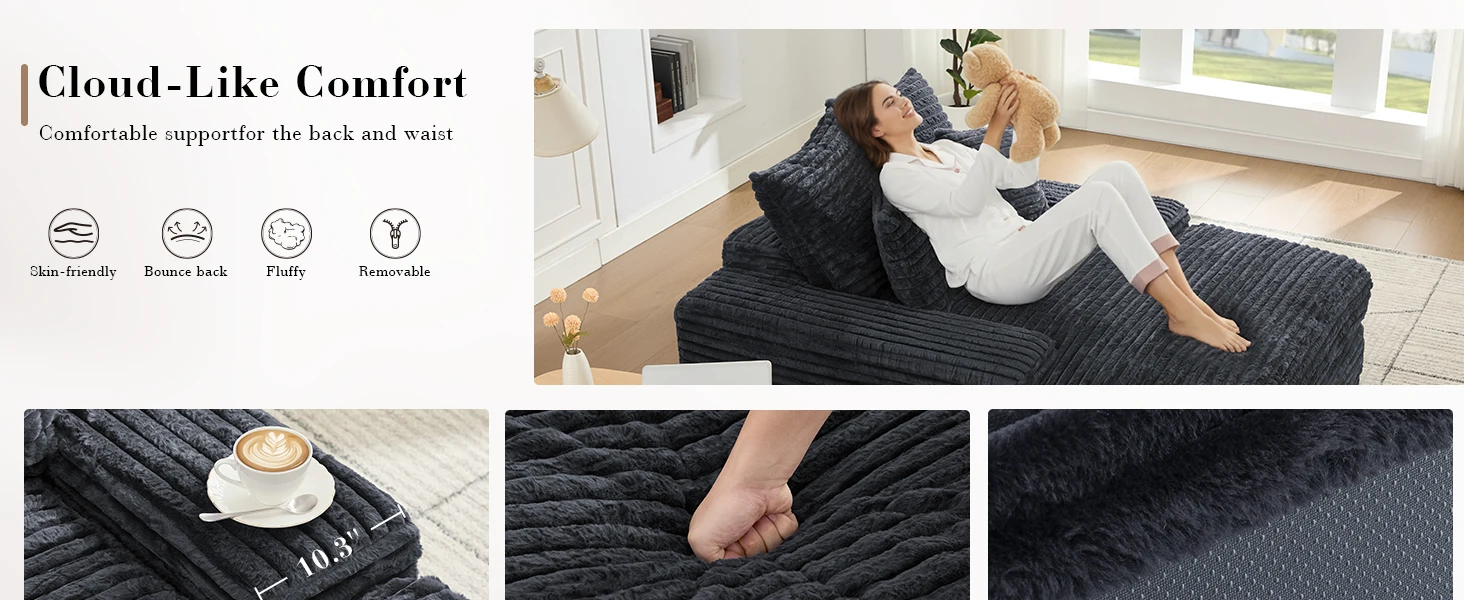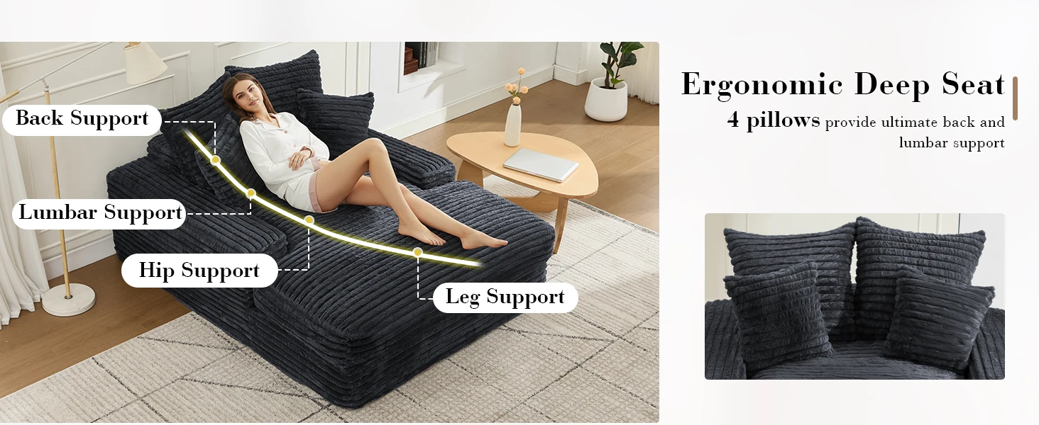 Design ergonomico e confortevole: questa chaise longue è dotata di un bracciolo extra largo da 26 cm per un rilassamento ottimale delle braccia. Il moderno divano letto include 4 morbidi cuscini che offrono un eccellente supporto per la schiena e la colonna lombare. Con una seduta profonda adatta a utenti di tutte le taglie, questa chaise longue ergonomica garantisce un'esperienza confortevole, sia che tu stia leggendo, guardando la TV o giocando.